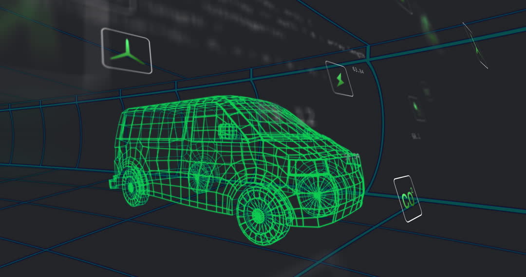 Illustration of a futuristic 3D van model projected in a digital tunnel environment, various data-driven holographic icons float around highlighting technological advancements. Ideal for showcasing innovative automobile technology, modern engineering concepts, and data visualization in automotive industry marketing materials or presentations on advanced vehicle design.