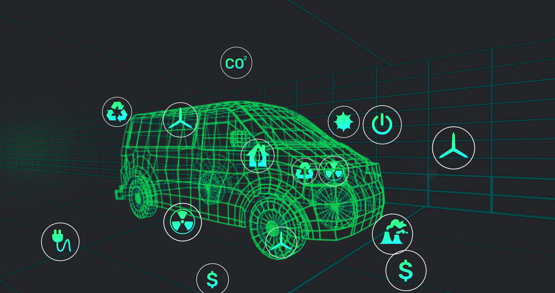 Futuristic 3D wireframe model of a van with digital technology icons illustrating eco-friendly and innovative automotive concepts. The emphasis on renewable energy and technology in transportation solutions highlights this video's use in presentations or articles about sustainable vehicle designs, advancements in automobile technologies, or AI integration in the automotive industry.