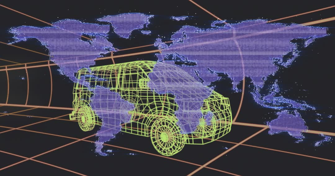Video illustrating a 3D van modeled against a dynamic digital grid with virtual representation of world continents. Ideal for showcasing future technology in transport or digital mapping. Useful for presentations on innovation, global network infrastructure or virtual reality advancements.