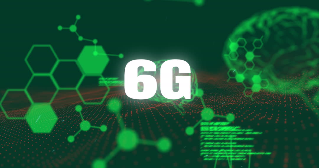 Abstract representation of futuristic 6G technology features chemical formulas and brain videory over dark green background. Ideal for illustrating innovation, cutting-edge technology, telecommunications, and scientific research concepts in marketing materials, blogs, and presentations.