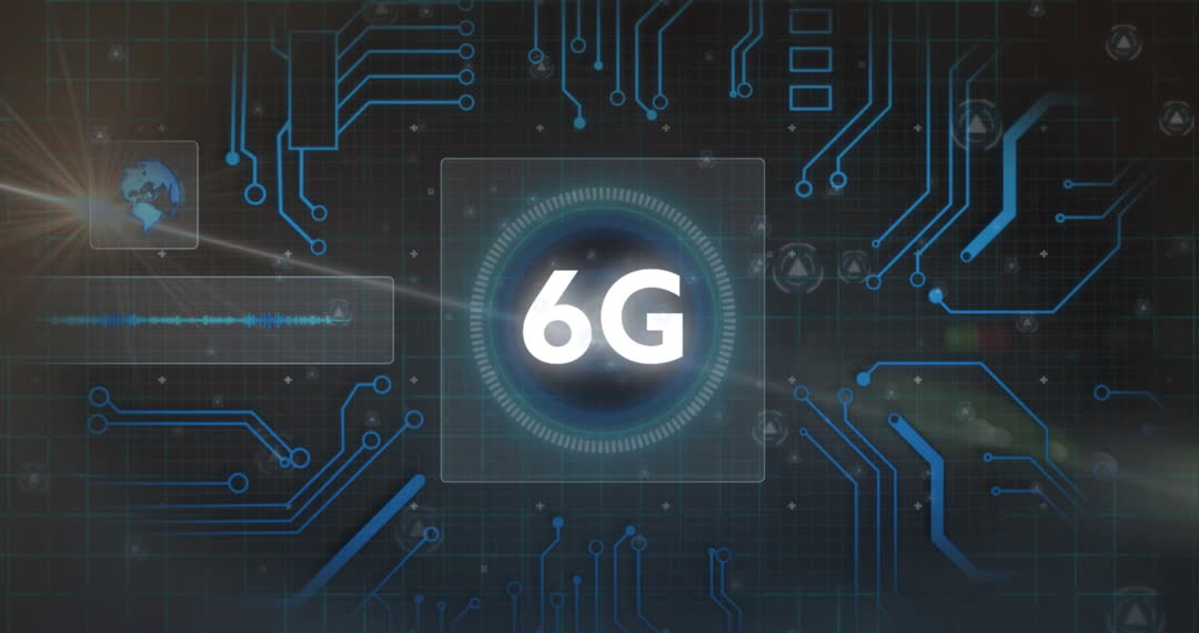 Depicts the concept of 6G technology with a digital circuit pattern in the background. It represents the realms of communication and data processing advancements. Ideal for use in technology presentations, telecom websites, and articles about future connectivity advancements.