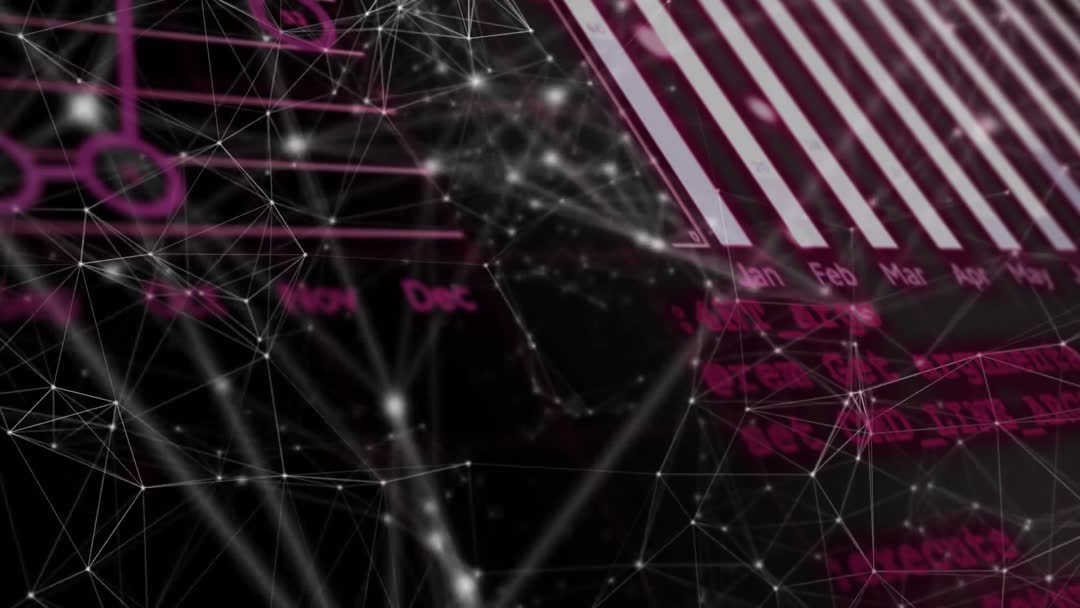Abstract and dynamic design depicting interconnected nodes and flowing lines over a translucent magenta bar chart conveys a futuristic stance on data visualization and technology. Perfect for use in tech presentations, innovation-focused promotional materials, and analytics-driven reports symbolizing modern network-based data solutions and connectivity advancements.