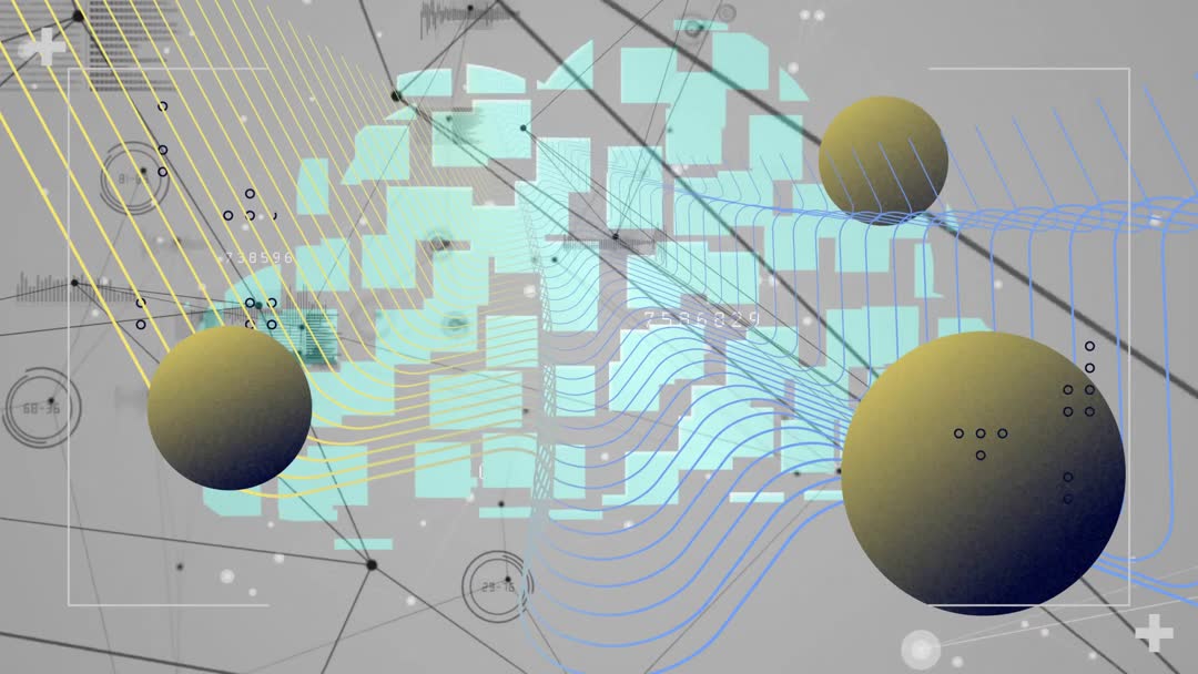 This visual incorporates futuristic geometric and abstract shapes overlaying dynamic digital waves, suggestive of technological advancement. The use of spheres and intricate lines highlights modernity and innovation. Suitable for presentations on digital innovation, graphical elements in video editing, or illustration of modern technological concepts and trends.