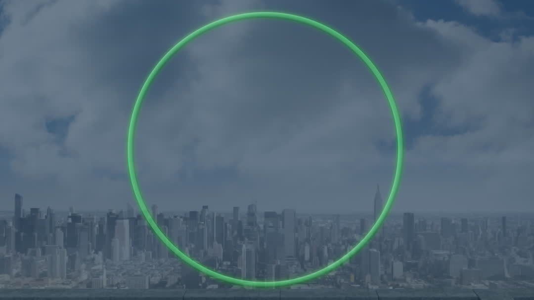 Animated visual presenting an aerial perspective of an urban city horizon, accompanied by a vibrant green circular graphic. The animated overlay creates a contemporary and futuristic atmosphere, accentuating the blend of urban living and advanced technology. This visual content is ideal for representations in technology firms, presentations emphasizing urban development, or background motifs for networking events reflecting on sustainability and innovation.