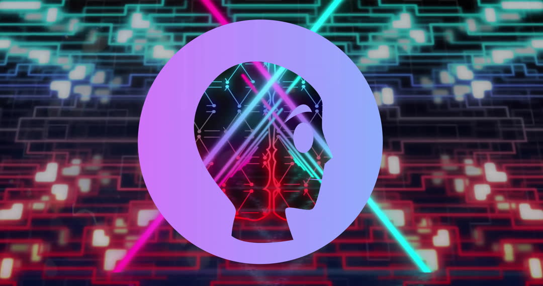 Features an animation visualizing the concept of AI with a robot silhouette within a circle. Vibrant neon lines suggest advanced technology and AI energy flow. Suitable for illustrating cutting-edge technology, AI advancements, machine learning content, or sci-fi themes. Ideal for digital platforms, tech articles, and futuristic design projects.