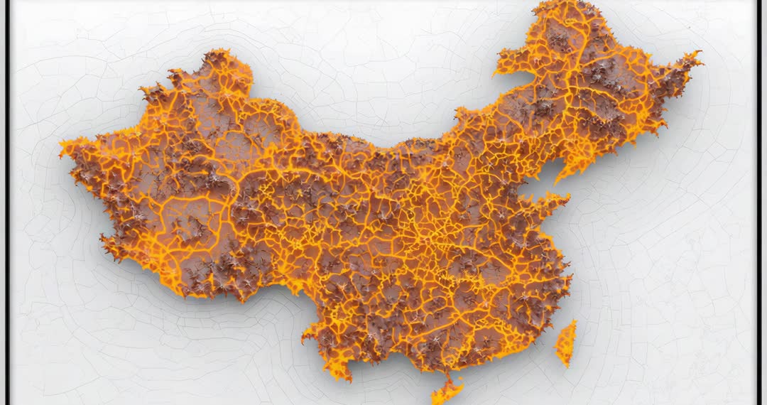 AI Generated Image. An AI-generated fractal representation of China, featuring glowing orange veins forming a complex network. The digital artwork emphasizes themes of technological growth and modernization. Ideal for use in articles or presentations about innovation, connectivity, or technological expansion in China. It serves educational and visual storytelling purposes, illustrating the dynamic development of infrastructure.