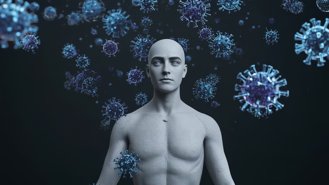 AI Generated Image. This digital artwork depicts an AI-generated human model surrounded by floating virus particles. The setting suggests a void, enhancing the themes of disease, biotechnology, and futuristic healthcare concepts. Visual is ideal for illustrating advancements in medical technology, introducing health science lectures, or conceptual AR technology designs.