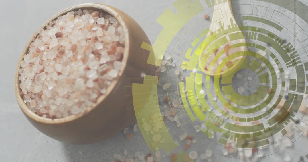 Blending natural elements with futuristic technology, this video shows pink salt in a wooden bowl being scanned by a rotating digital interface. Perfect for themes related to innovation in food technology, digital precision in measuring natural resources, or futuristic design in culinary fields.