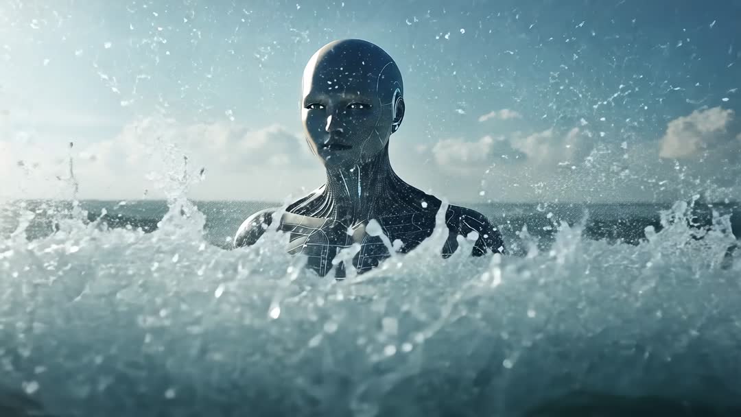 AI Generated Image. Featuring metallic android emerging from ocean, surfacing through breaking waves and water spray, displaying glowing circuitry across neck and chest and chrome finish reflecting soft daylight. Camera framing at medium-close with horizon line in background, cinematic teal color grading and shallow depth of field creating dramatic futuristic mood. Serving technology corporate videos, AI concept trailers, sci-fi film openers, website hero loops, marketing campaigns for robotics and marine technology, editorial features about artificial intelligence and human-machine interaction. Recommend adding title overlay in upper third, looping slow-motion sequence for background use, applying subtle sound design with ambient waves and synth tones, and color grading to match brand palette.