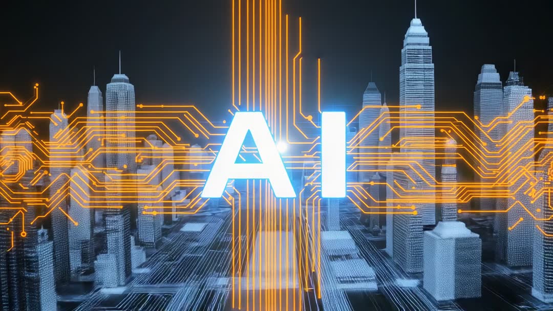 AI Generated Image. Animation depicts the integration of AI technology within a cityscape, symbolized by animated blue 'AI' letters with connecting orange circuitry. Suitable for illustrating the evolving role of AI in urban planning, cybersecurity advancements, and futuristic innovations. Ideal for use in presentations or videos discussing smart cities and AI integration in modern society.