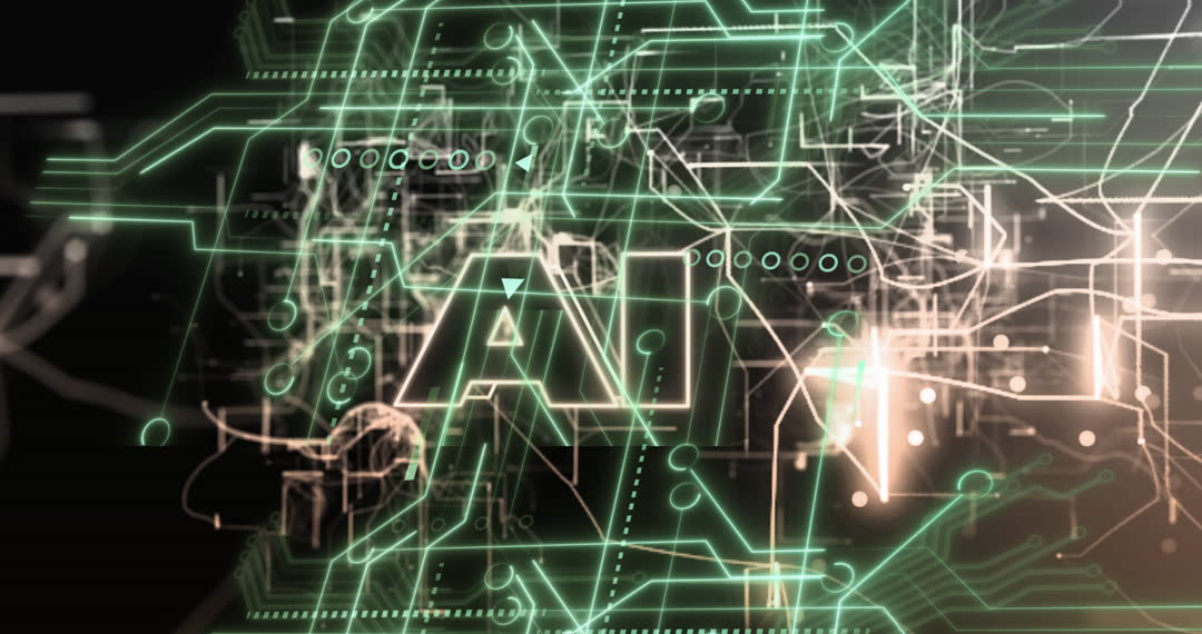 Dynamic visual of AI text integrated into a complex data circuit. Depicts advanced computing and digital systems. Ideal for use in technology articles, workshops on artificial intelligence development, or presentations about future tech innovations and trends.