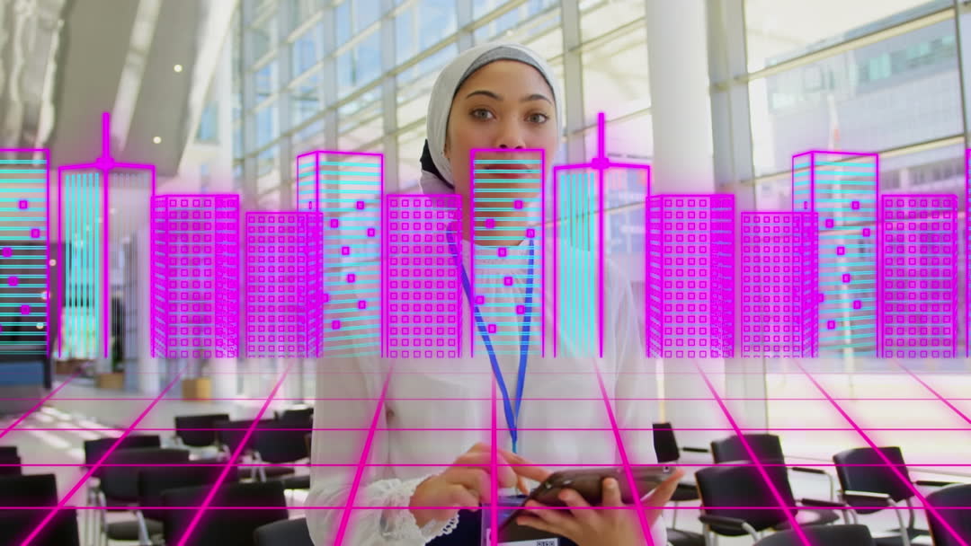 This visual depicts a businesswoman in hijab using digital technology to interact with a futuristic 3D architectural projection in an office. Suitable for topics related to modern architecture, innovative business solutions, digital transformation in corporate spaces, and the role of technology in enhancing professional environments.