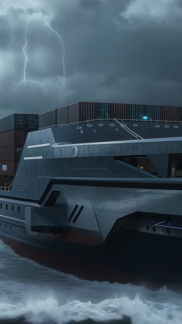 AI Generated Video. Showing futuristic armored cargo ship cutting through stormy sea, lightning striking overhead and container stacks flashing faint blue beacons. Emphasizing massive hull slicing through towering waves, spray and foam creating dynamic foreground motion and cinematic vertical composition. Conveying intense mood with dark storm clouds, high-contrast metallic highlights, and sense of forward momentum and danger. Suited for sci-fi trailer, maritime safety feature, shipping industry campaign, insurance or risk management presentation, book cover, mobile ad, website hero, or visual effects reel. Providing clean negative space in upper frame for bold headline or logo overlay while maintaining dramatic action in lower frame.