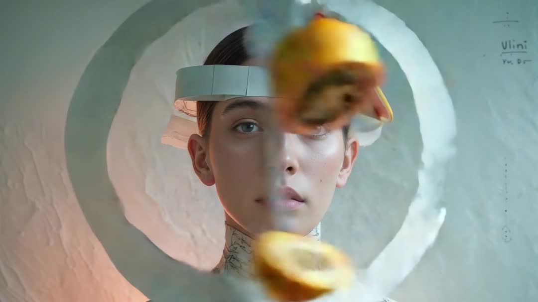 AI Generated Image. This video captures a model wearing a creative headpiece with various fruits, such as kiwi, grapefruit, and pear, encircling her in a dynamic and artistic manner. Set against a clean studio background, the scene offers a futuristic and minimalistic vibe perfect for modern art or innovation-focused projects. Ideal for use in fashion spreads, sustainability themes, and creative advertising campaigns centered around innovation and surrealism.