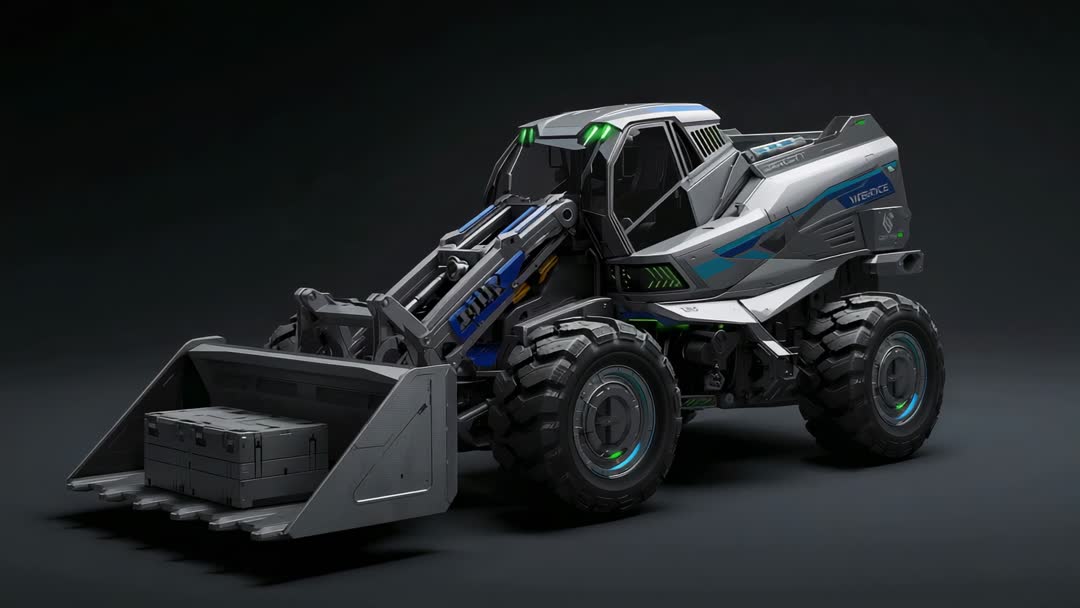 AI Generated Image. Video clip showcasing futuristic articulated loader reacting to shifting light while revealing hydraulic actuators, heavy treads, and cargo crate secured in front bucket. Composition featuring tight three-quarter angle, low-key studio lighting, and crisp material details emphasizing metal, rubber, and LED elements. Use for technology presentations, game trailers, construction automation demos, concept vehicle portfolios, industrial product ads, and editorial features on robotics and mechatronics. Ideal for animated cut scenes, promotional reels, UI hero banners, background plates for VFX, and training materials on heavy equipment design. Asset providing clean silhouette, clear mechanical motion cues, and strong visual focus on hydraulics and wheel systems, allowing cutaway animations and close-up macro shots. Color palette balancing gray tones with blue and green LED accents for modern tech feel.