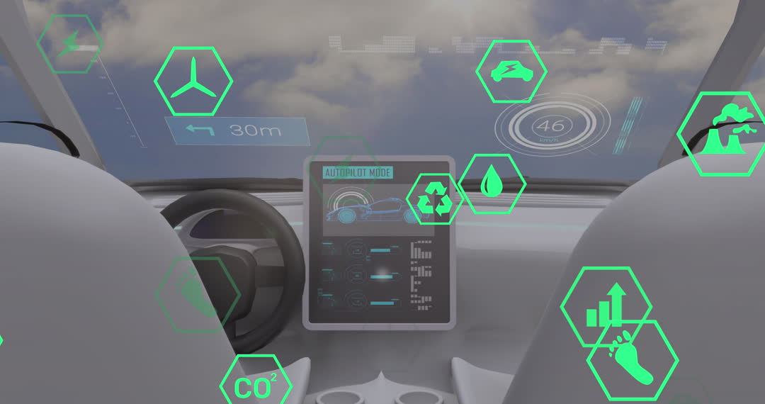 This digital animation visualizes a futuristic autonomous car interior showcasing an advanced digital interface with various icons and data points. The graphics present concepts like autopilot, vehicle status monitoring and environmental metrics through augmented interfaces. Perfect for use in articles, marketing materials, or presentations related to innovations in automotive technology, smart vehicles, and digital transformation in transport.