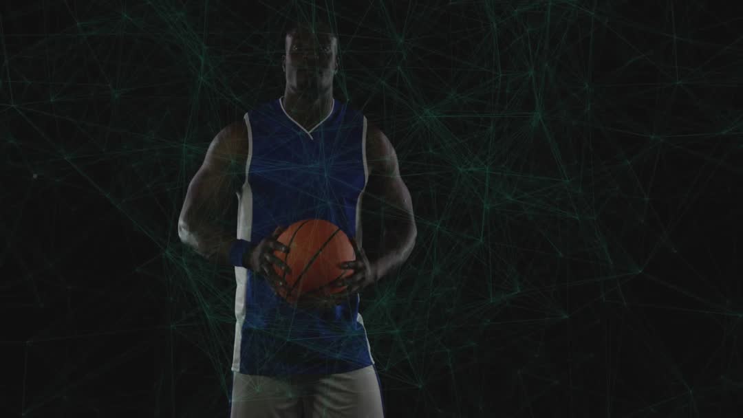 Athlete holding basketball in dynamic environment with digital network graphics. Symbolizes integration of technology in sports, perfect for themes on innovation, training techniques, or sports science.