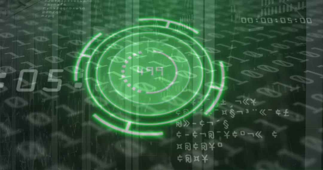 The digital visual displays a futuristic interface with binary code patterns and a dynamic green scanning animation, reminiscent of advanced technology systems and data processing environments. Ideal for use in presentations or media relating to digital innovation, cybersecurity, or data analytics.