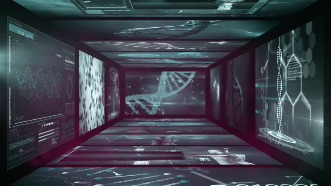 Tunnel displays futuristic approach to biological data with DNA videory. Suitable for illustrating concepts in genetics, digital innovation, and technology. Ideal for use in educational content, science fiction themes, and presentations related to scientific advancements.