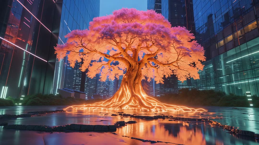 - Futuristic Bioluminescent Tree in Urban Plaza with Illuminated Roots
