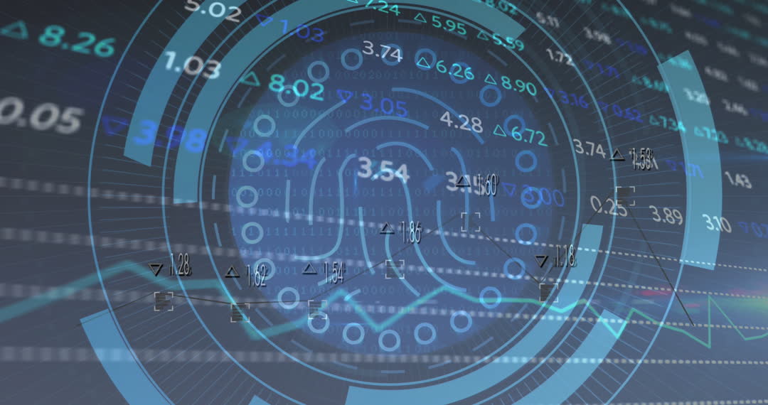Visual represents integration of biometric technology with financial data analytics. Ideal for use in presentations or articles on advancements in cyber security, digital economy, and intersection of finance and technology. Suitable for illustrating privacy concerns, market analysis tools, and innovative technology solutions in fintech.