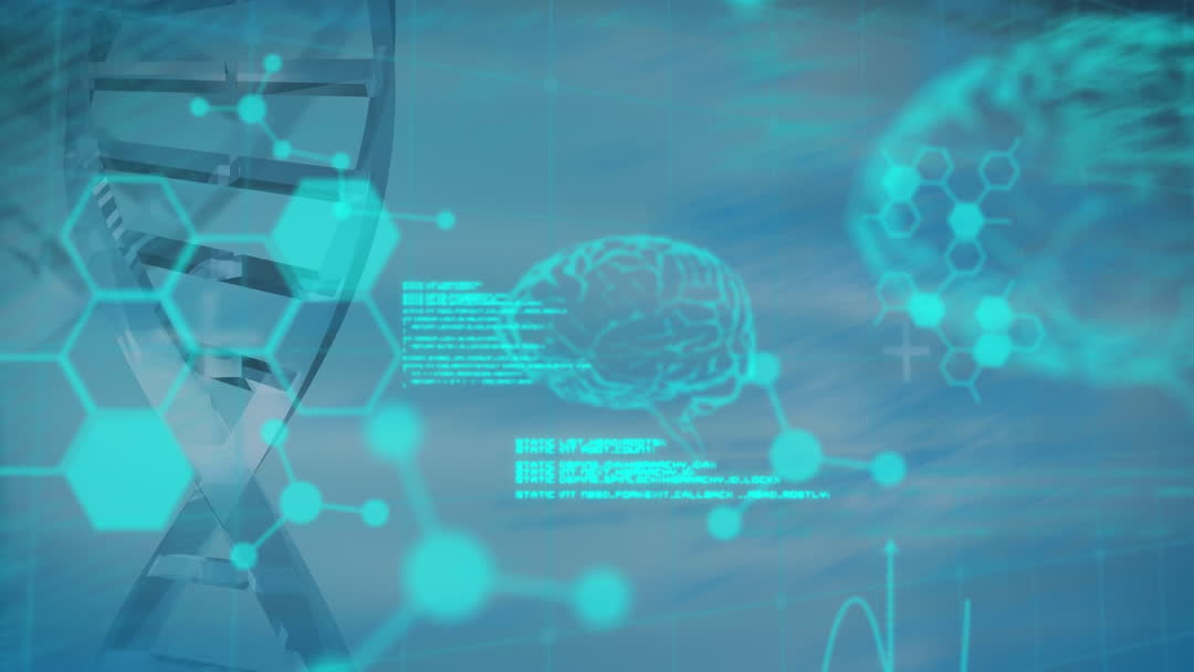 Illustrating the integration of biotechnology and data science, this stock media showcases a spinning DNA strand alongside digital data graphics, including a brain outline, suggesting biotechnological processes and futuristic innovation. Ideal for use in scientific research presentations, educational content on genetics, or as visual elements in tech-themed media that explore advancements in science.