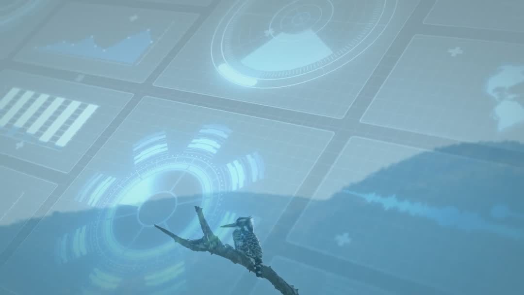 The video showcases a woodpecker-like bird sitting on a branch with digital grid panels pulsating and rotating around it, symbolizing a blend of nature and technology. The imagery communicates a futuristic interface used for data monitoring or environmental surveillance. This visualization can be effective for technology firms, wildlife monitoring organizations, or presentations about innovations in environmental data analysis.