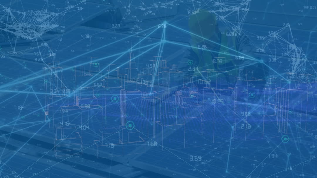 Visual depicting interconnected networks with flowing data and numeric annotations creates a sense of digital connectivity and futuristic technology. Nodes and lines unfold over a digital landscape presenting an video of data interaction used in tech presentations, illustrating concepts of connectivity and advanced data processing. Useful for cybersecurity, digital networking presentations, or background videos in tech-focused projects.