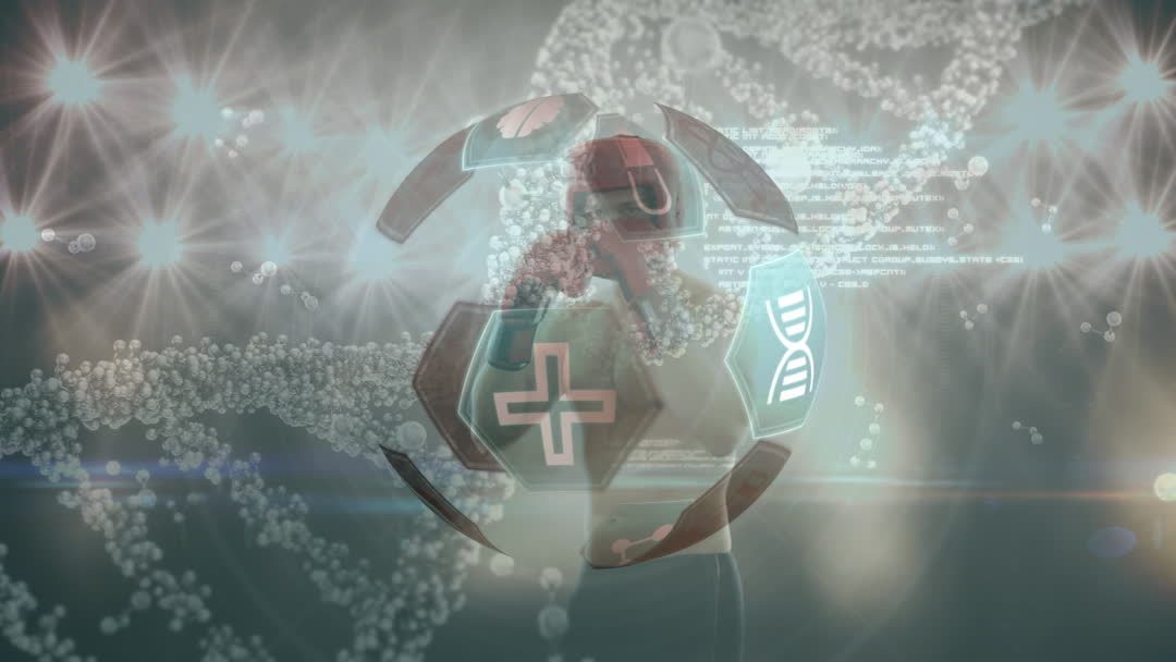 This video displays a futuristic concept combining sports with technology, featuring a male boxer intertwined with digital effects of a DNA helix and healthcare themes. Ideal for use in articles about the intersection of health and technology in sports, illustrating advancements in sports science, or promoting fitness technology products.