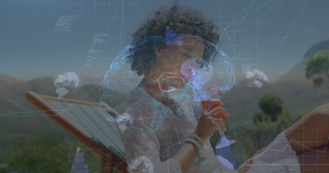 Futuristic concept showcasing advanced technology merging with leisure activities. Mixed race woman relaxes in serene outdoor setting while visual digital interface overlays, suggesting themes of global communication and wellness. Perfect for depicting future tech trends, wellness retreats, or digital connectivity.