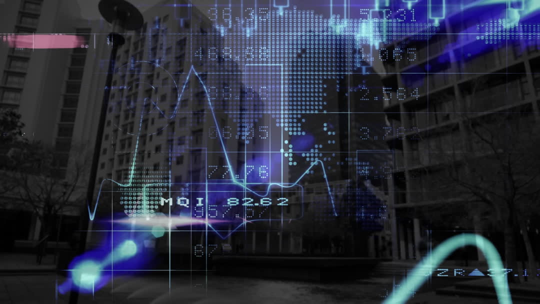 Digital overlay blends dynamic graphs and numbers with urban architecture, highlighting interconnected world of finance and technology. Ideal for illustrating articles on blockchain, digital currency, global economics, and future trends affecting modern businesses.
