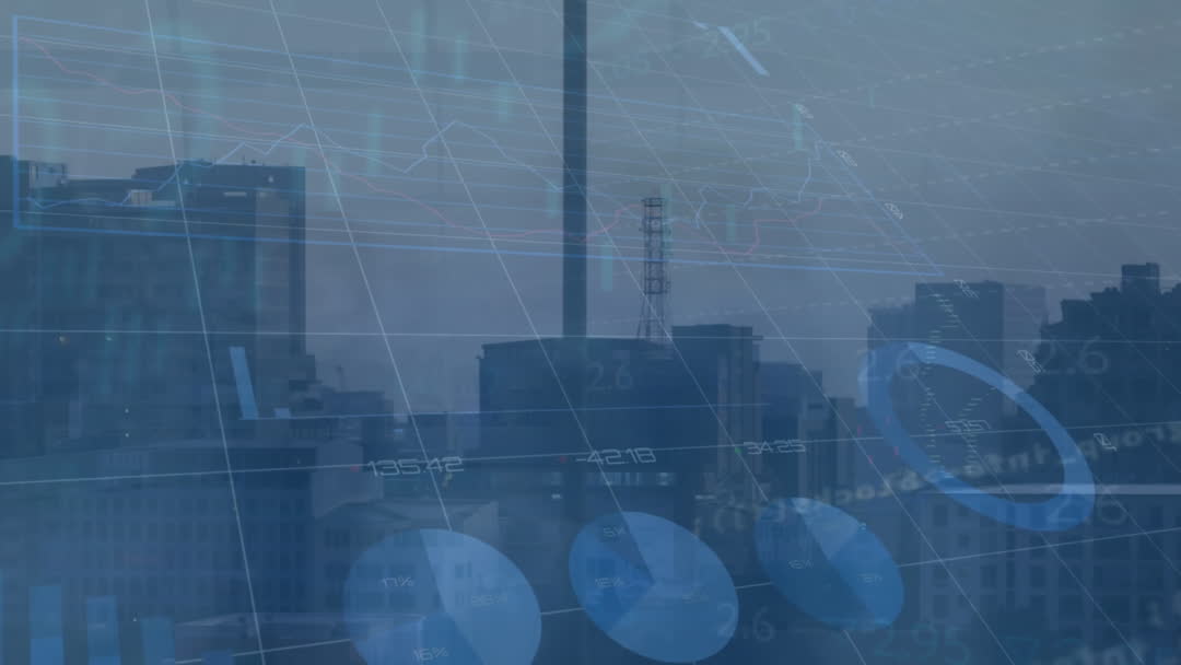 This visual combines cityscape videos with digital overlays of graphs and statistics, conveying the concept of business growth and financial progress. Perfect for presentations on technology in finance, economic forecasts, and urban development projects, offering a futuristic view of data-driven insights in an urban environment.