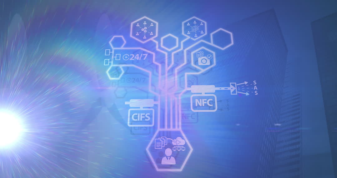 Visual depicts digital transformation in business utilizing futuristic technology. Bright icons represent connectivity elements like NFC and CIFS, ideal for presentations on tech innovation and corporate networking strategies.