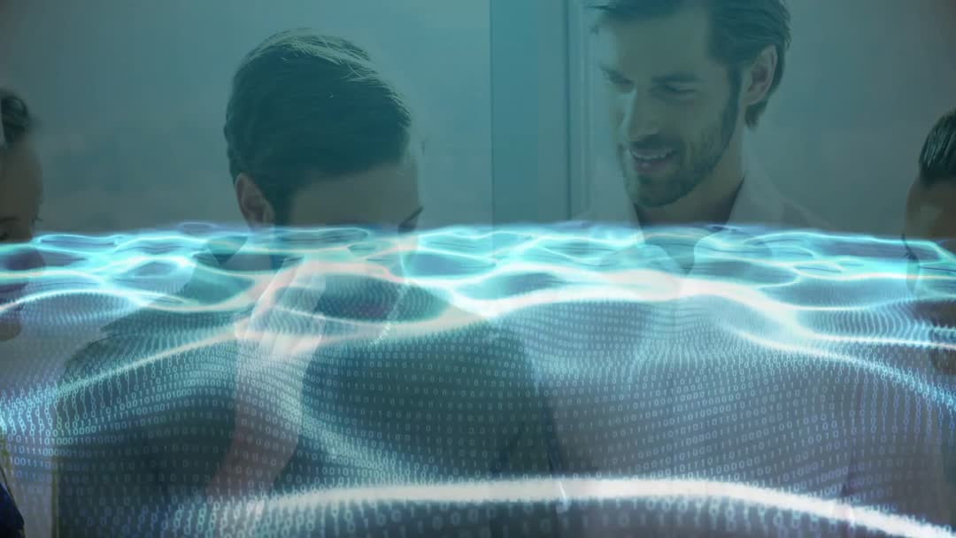 This scene captures a group of office professionals in a modern workplace setting as they engage with digital holographic waveform displays for data analysis. The overlay of binary code indicates an advanced technological approach to business analytics, symbolizing innovation and collaboration within a forward-thinking corporate environment. Ideal for use in articles or presentations about technology integration in business, future work environments, or promotional materials highlighting cutting-edge business solutions.