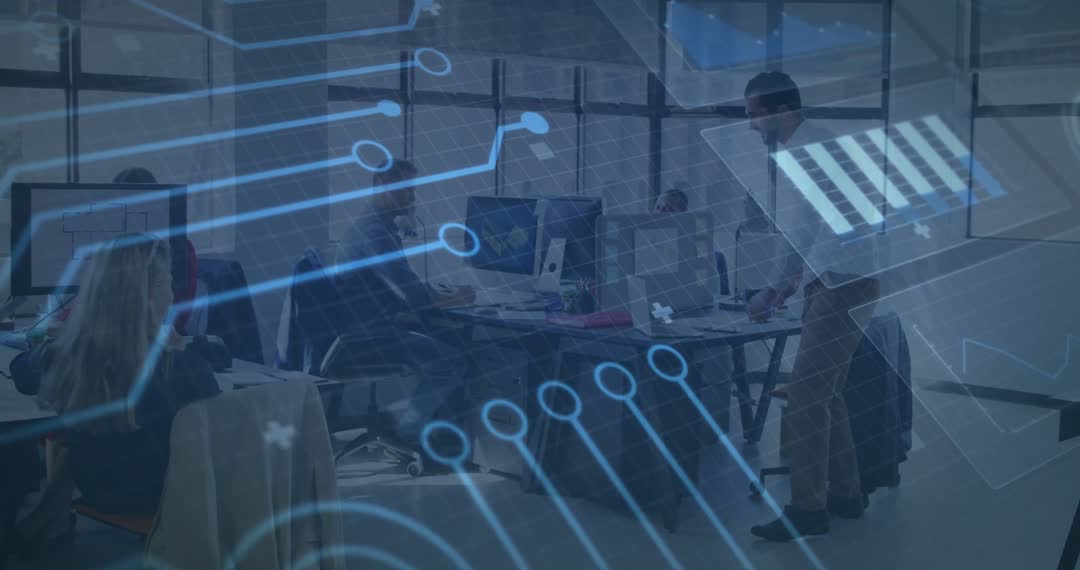 This video illustrates a collaborative office setting with a digital circuit pattern overlay, highlighting concepts of technology and innovation in a corporate environment. Ideal for presentations on modern business methods, tech-driven workplaces, and teamwork in the digital age. Useful for articles discussing advancements in office technology and corporate strategies.