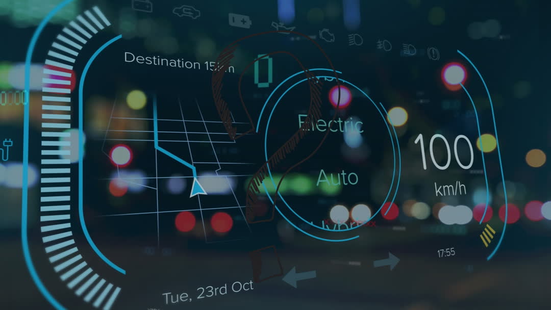 Visual displays of modern vehicle technology including speedometer and data processing overlaying nighttime cityscape with blurred traffic lights. Suitable for topics on automotive technology, smart cities, and electronic navigation systems. Ideal for illustrating advancements in car interfaces and digital innovations in urban environments.