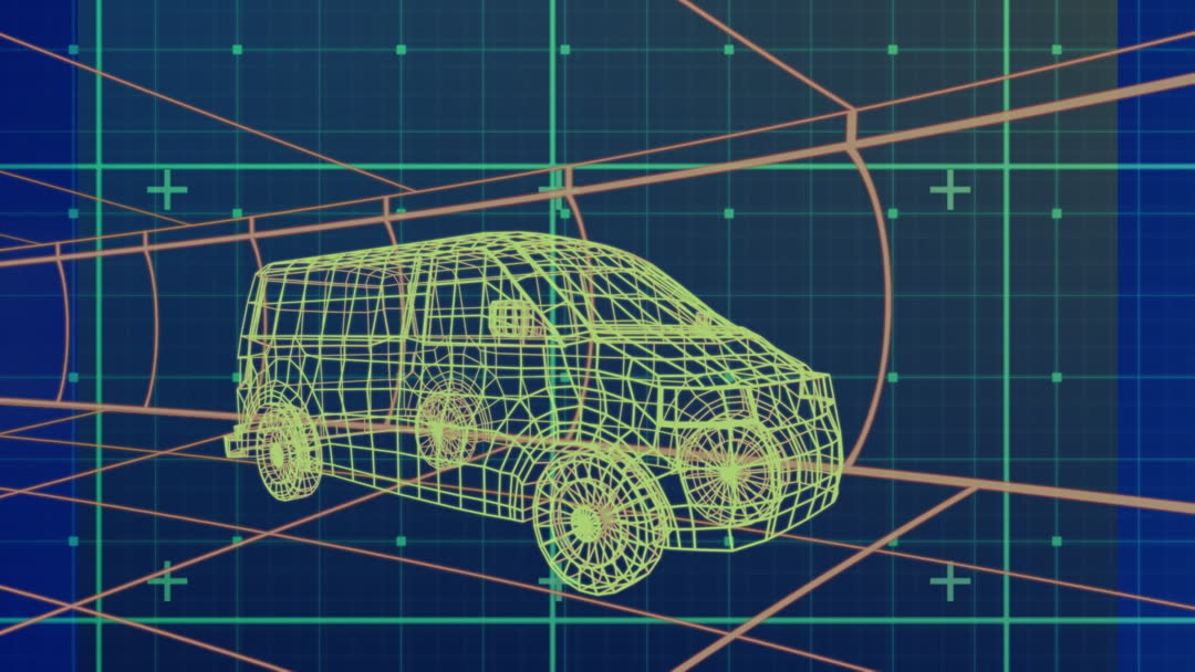 Futuristic 3D wireframe design of a van in a digital environment. Neon lines form the structure against a complex data grid, emphasizing innovation in car design and engineering technology. Suitable for illustrating automotive design trends, digital drafting techniques, or articles on technology advancements in the car industry.