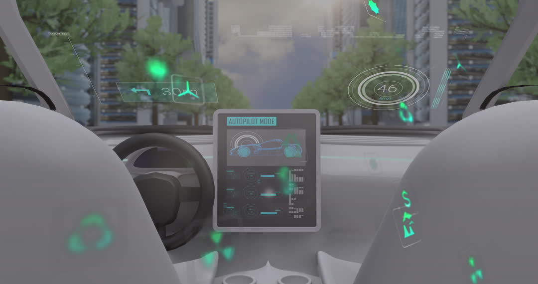 Modern conceptual representation showing a futuristic car interior with a digital dashboard displaying autopilot mode and various data icons. Suitable for websites, presentations, and campaigns focused on innovations in smart transportation and eco-friendly urban solutions.