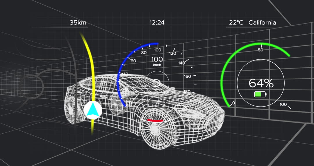 Illustration depicting advanced vehicle dashboard with digital interface overlays. Visuals include speedometer, GPS, and battery levels. Ideal for topics on automotive technology, futuristic vehicles, or transport innovation uses.
