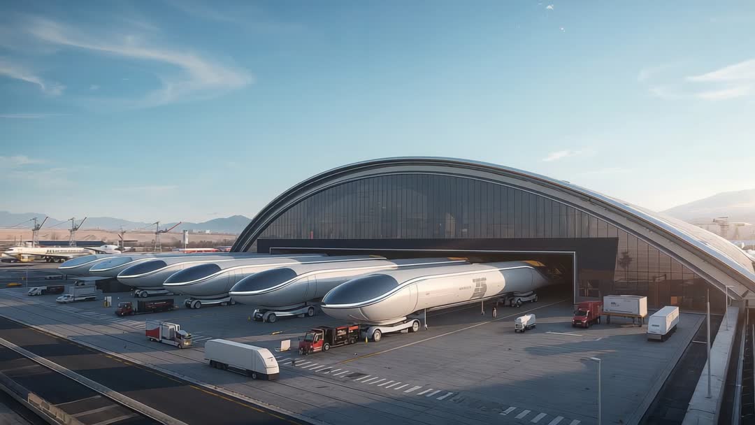AI Generated Image. Showing gentle left-to-right pan across curved hangar apron while five sleek cargo pods are aligning with autonomous tractors and support trucks. Featuring cinematic morning light, reflective metallic surfaces, long shadows, distant mountains and overhead rail cranes. Providing ample negative space in upper sky for title or on-screen graphics and clean lower third area for captions. Suiting opener use for corporate logistics videos, technology conference backdrops, website hero banners and advertising campaigns for transport startups. Serving visual centerpiece for investor pitches, product demos, trade show displays and storyboard sequences exploring future of supply chain. Working well for editorial pieces about smart transport, rail-linked terminals, sustainable freight and industrial innovation. Suggesting slow cinematic grade, subtle motion blur and soft color grading to enhance futuristic mood.