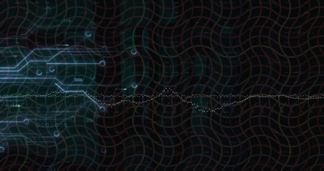 Visual abstraction featuring a circuit board pattern combined with a linear soundwave overlaid on a moving grid. This videory evokes themes of advanced technology and digital communication. Great for use in indie electronic music video backdrops, digital technology presentations, or branding material related to innovative tech solutions.