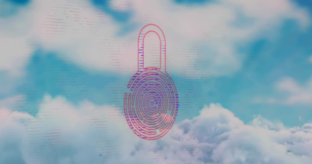 Futuristic video depicting a digital lock shape seamlessly integrated into a sky filled with clouds. Illustrating themes of cloud security, this video is perfect for use in contexts related to technology, cybersecurity, and biometric authentication. Versatile for websites, presentations, or ads on internet privacy and digital protection.