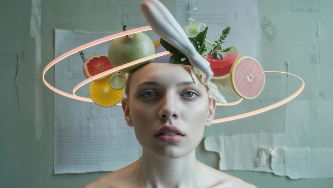 Futuristic Citrus Hat with Neon Circle and Surreal Aesthetics Video