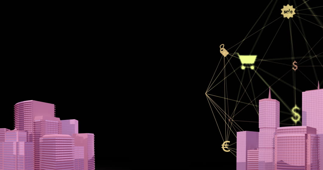 The composition shows a stylized pink cityscape juxtaposed with a digital network of connection icons such as currency and commerce symbols hovering above buildings. Reflecting concepts around technology advances related to urban environments, electronic commerce, and global networks in a visual representation, it can be ideal for illustrating smart cities, business conferences, tech-oriented publications and digital economy articles. Strong focus on connectivity underlies modern infrastructure applications.