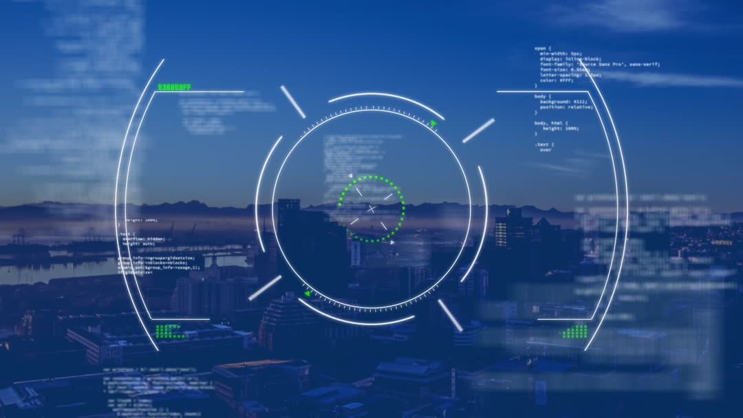 The video presents a futuristic animation overlaying a cityscape with digital data visuals. Circular HUD elements and flowing code give the impression of high-tech surveillance and advanced data processing. Perfect for illustrating themes of technology, smart cities, digital transformation, and the integration of innovation into urban environments.