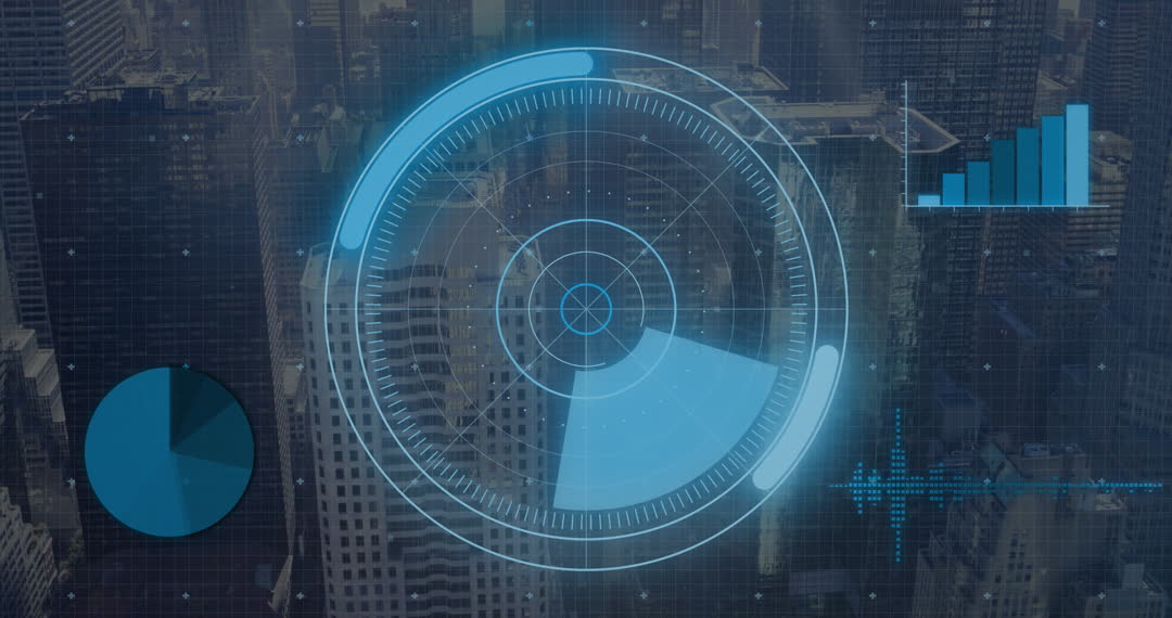 This depiction of a cityscape with a digitally enhanced overlay showcases advanced digital communication and data network concepts. The graphic visualization includes elements like a radar interface and data charts, illustrative of modern technology's integration with urban environments. Ideal for use in technology, business strategy, smart city development presentations, and global network solutions, communicating innovation and modern digital infrastructure.