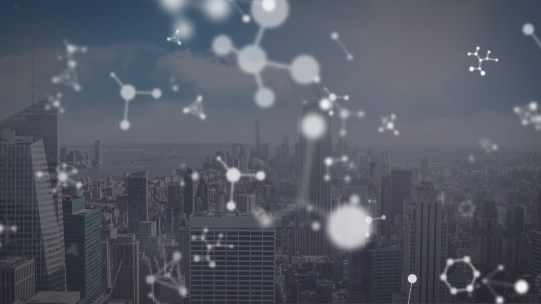 Image depicts a futuristic concept where molecular diagrams are overlaying a city skyline, illustrating the integration of technology and urban environments. Useful for presentations on technology influence in modern cities, innovation in business networks, or virtual connectivity.