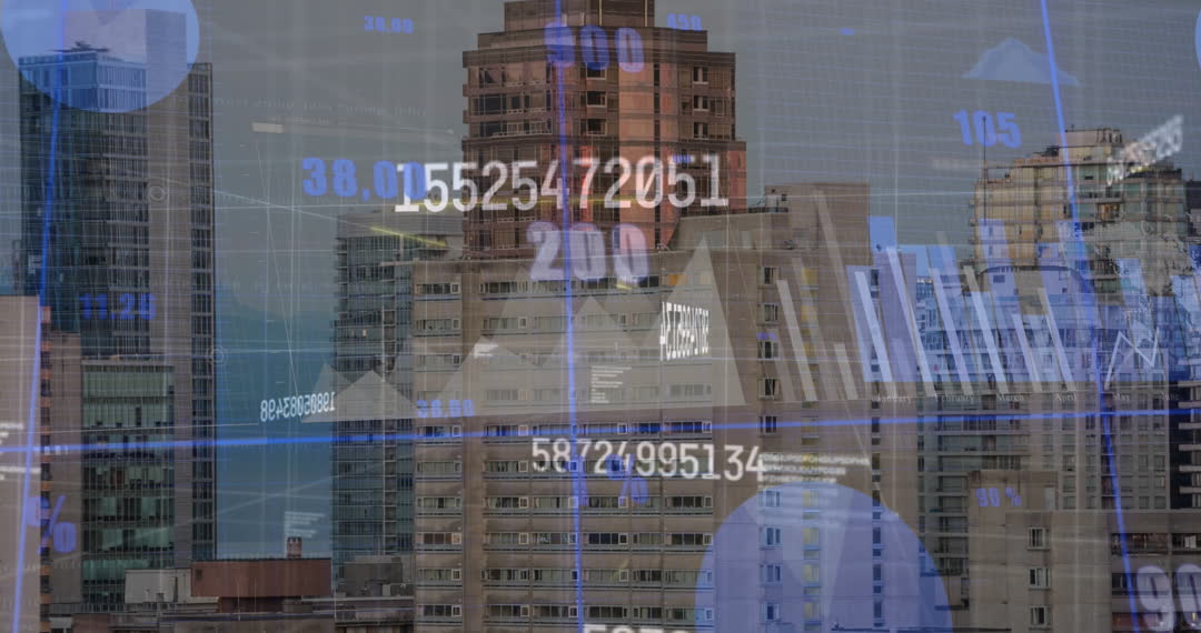 This visual combines a modern cityscape with superimposed financial data, highlighting the intersection of urbanization and technological advancement in business and economy. Ideal for use in presentations on urban development, economic trends, or digital transformation in businesses.
