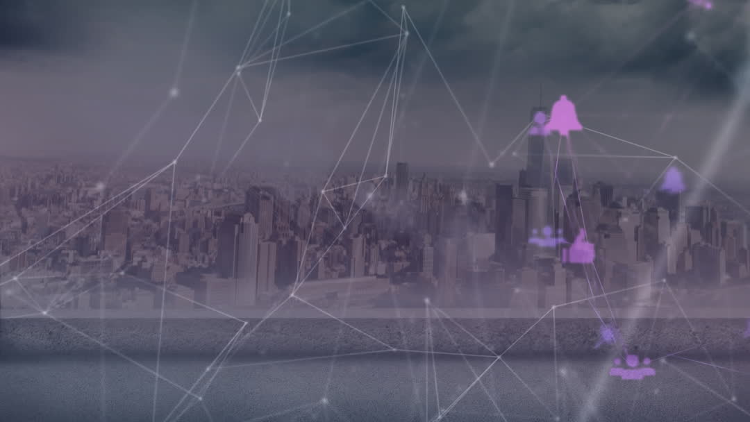 Digital animation showing city skyline intertwined with abstract network connection lines, emphasizing technological connectivity and communication. Ideal for illustrating themes of global business, interconnected systems, or urban future. Useful for marketing materials, tech industry publications, or educational content on online networks.