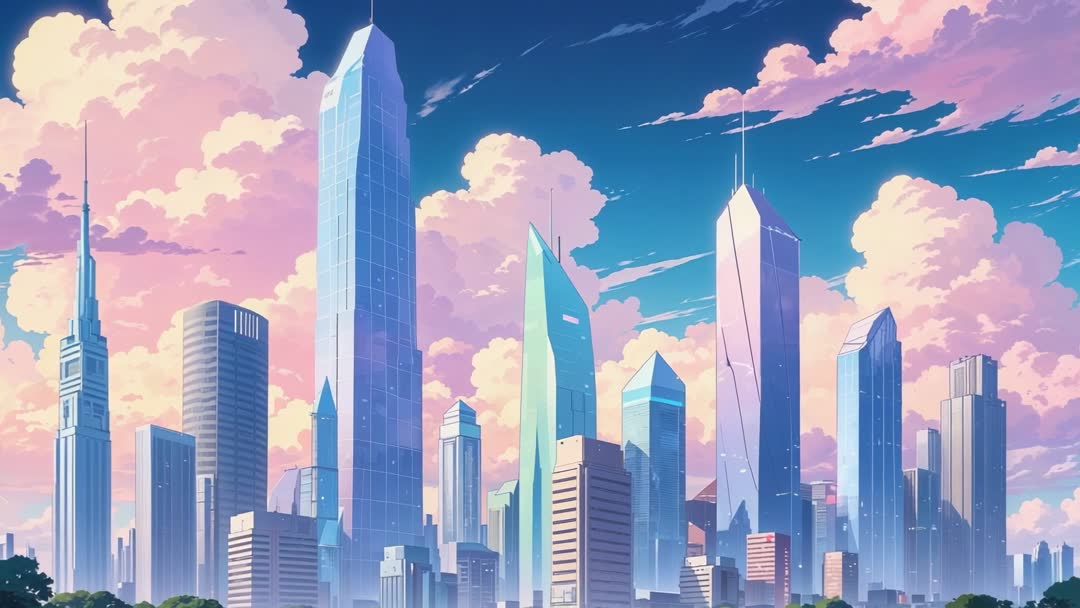AI Generated Video. Vibrant illustration showcasing a futuristic city with towering glass skyscrapers reflecting pastel colors of a sunset. Clouds shift hues above a serene urban park, adding depth to the modern architectural scene. Perfect for illustrating futuristic or sci-fi themes, urban planning concepts, or innovative architectural designs.